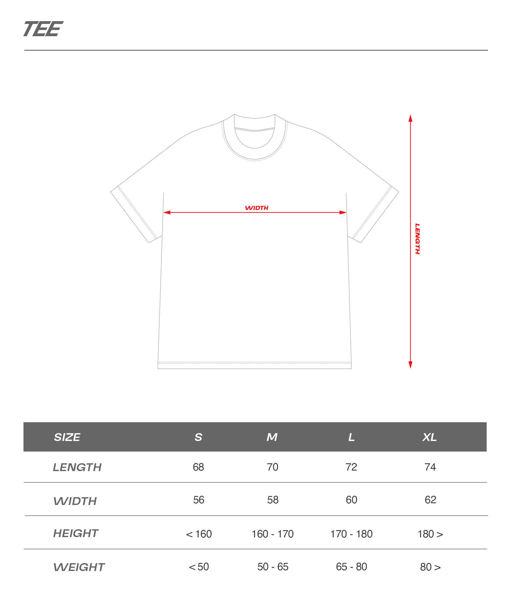 Each product includes a size chart for reference. Measurements are taken manually and slight variations may occur.